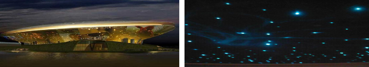 上海古順電子科技有限公司在激烈的競(jìng)爭(zhēng)中以優(yōu)良的性價(jià)比和良好的合作精神為世博演藝中心國(guó)際電影廳提供了光纖照明裝飾。