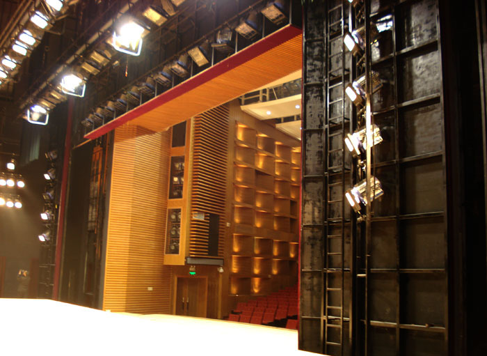 活動(dòng)假臺(tái)口按驅(qū)動(dòng)形式又可分電動(dòng)和手動(dòng)。燈光渡橋主要功能是安裝臺(tái)口內(nèi)面光燈具以及為操作面光燈具提供平臺(tái)。小型劇院多為固定式,大中型劇院多將假臺(tái)口升降部分做成活動(dòng)的燈光渡橋,活動(dòng)燈光渡橋利用滑輪裝置控制其升降,并在其兩側(cè)裝有導(dǎo)軌保持穩(wěn)定。